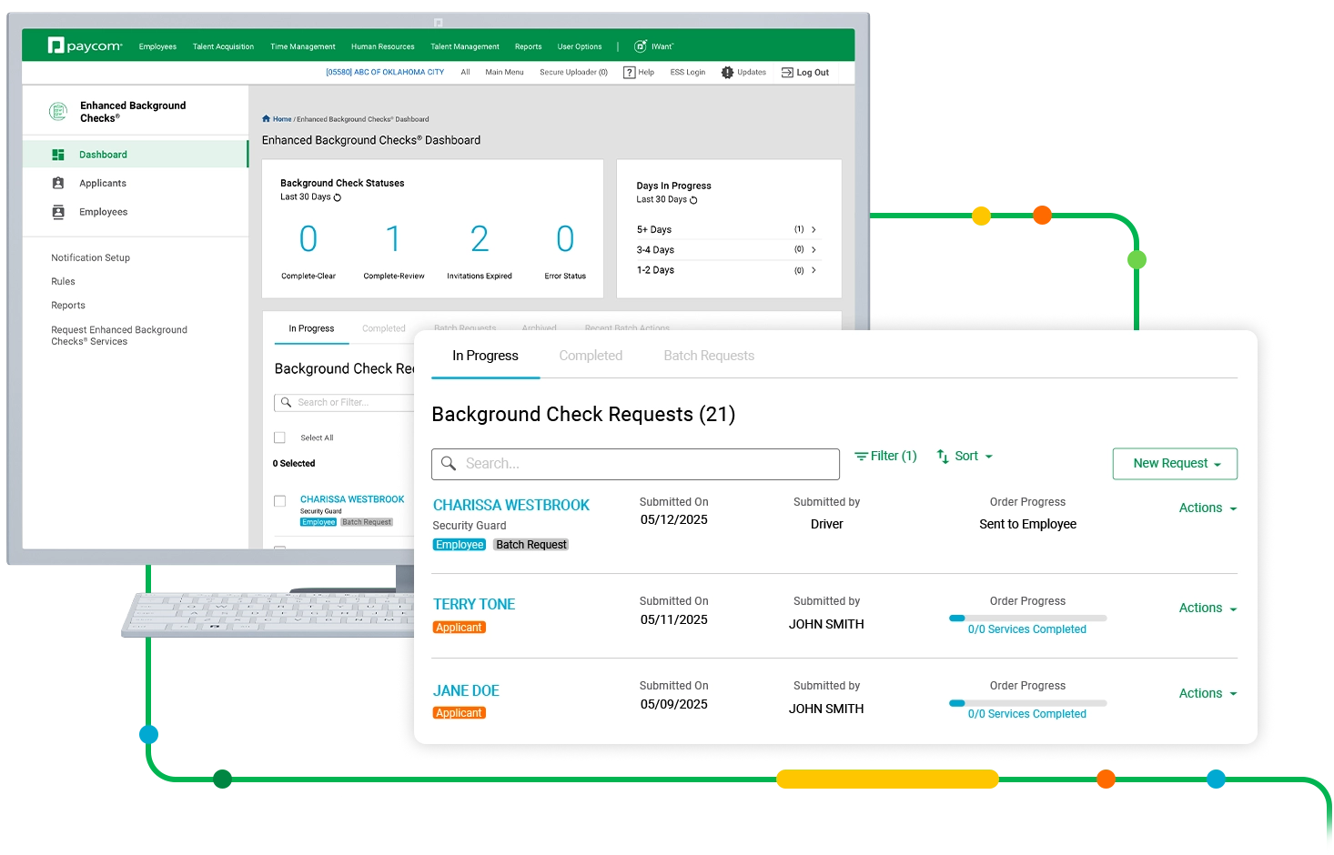 Sort, filter and get visibility on background checks. Quickly view statuses, run reports for individual candidates and employees, and review reasons for drug-screening delays.